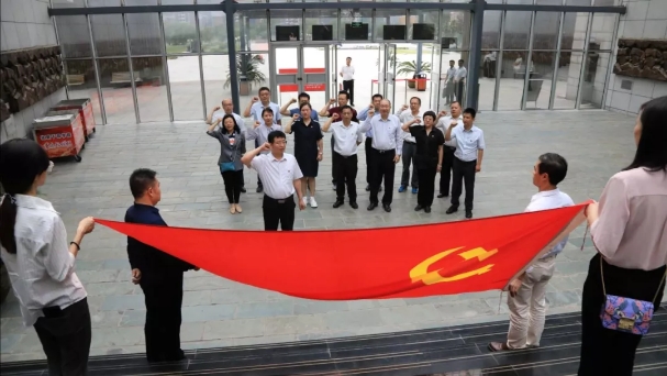 在東北抗聯(lián)史實陳列館大廳,中國冶金報社黨委書記、副社長陳洪飛帶領(lǐng)全體參加活動的黨員重溫入黨誓詞。