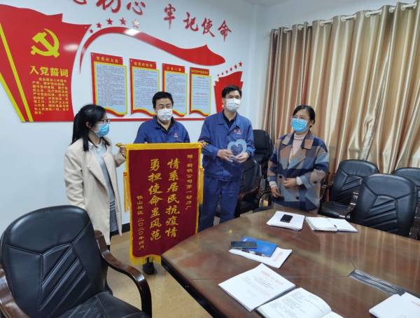 近日,江西新鋼街道辦鐵山社區領導前往新余鋼鐵集團有限公司動力廠里贈送錦旗,感謝該廠領導及廠志愿者對鐵山小區疫情防護工作的大力支持和無私幫助。疫情期間該廠派遣20余名志愿者晝夜輪流值守小區加強進出人員管理。
