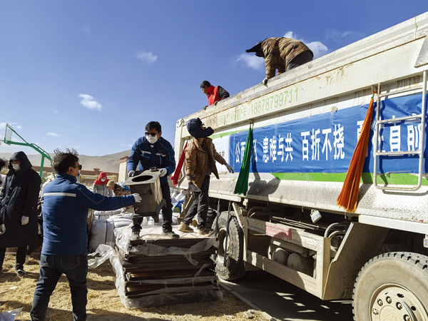 圖為中國(guó)二十二冶西北公司職工正在裝運(yùn)救援物資。