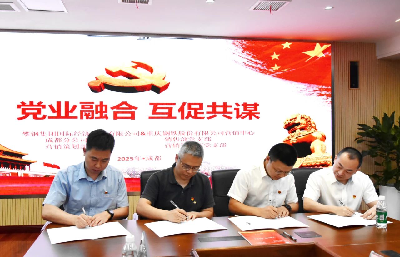 近日,重慶鋼鐵營銷中心銷售部、營銷管理部與攀鋼國貿成都分公司、營銷策劃部聯合開展了以“黨業融合?互促共謀”為主題的四方黨支部共建活動。重慶鋼鐵高級副總裁謝超,副總裁兼營銷中心黨總支書記、總經理章遠杰,攀鋼國貿黨委書記、董事杜健,黨委副書記、總經理蒲禮國等出席共建活動。