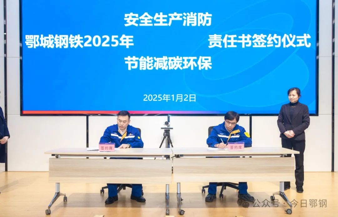 黃大軍代表該公司分別與鋼軋廠、寬厚板廠、安全保衛部、能源環保部現場簽訂了2025年安全生產消防、節能減碳環保責任書。
