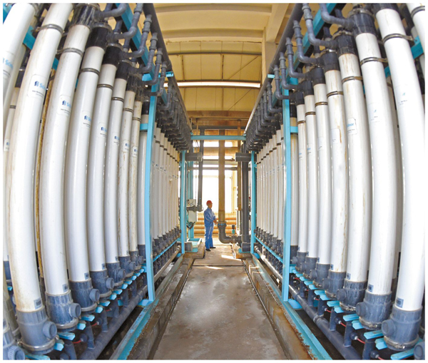 近年來,太鋼以科技創新和技術進步為支撐,創新研發鋼鐵廢水雙膜法技術,形成了“工業廢水+城市 生活污水”規模化綜合利用模式,全面實現廢水資源化。太鋼噸鋼消耗新水量由10年前的10噸多降至目前的2.5噸左右,工業水重復利用率達到98%以上,在全國冶金行業名列前茅。圖為8月6日該公司污水處理超慮工序作業一景。(特約通訊員 王旭宏 攝)