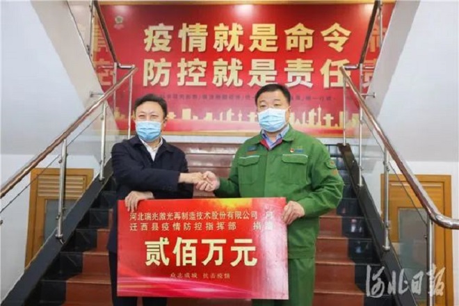 2020年,瑞兆激光在河北省民營企業中率先捐款200萬元,向武漢市捐款捐物76萬元。