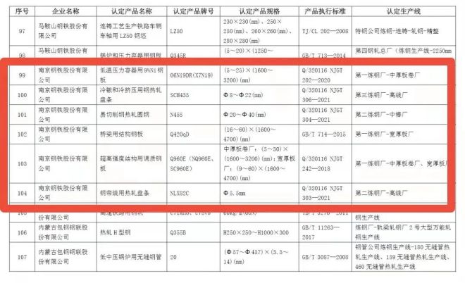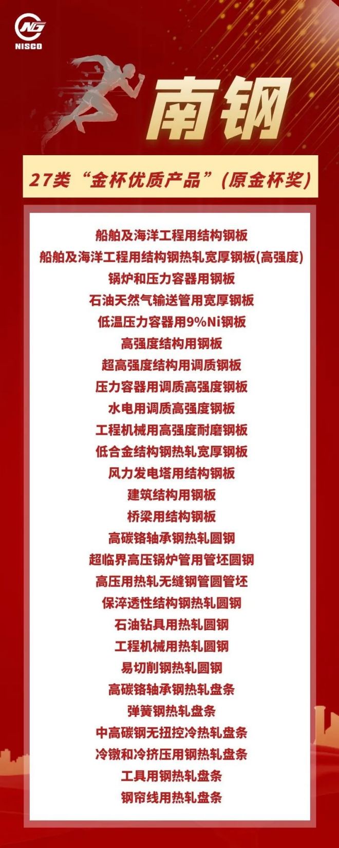 4月1日,在中國鋼鐵工業協會發布的2021年冶金產品實物質量品牌培育產品名單中,南鋼低溫壓力容器用9%Ni鋼板、超高強度結構用調質鋼板、橋梁用結構鋼板、易切削鋼熱軋圓鋼、冷鐓和冷擠壓用鋼熱軋盤條、鋼簾線用熱軋盤條等6項產品審定冠名為“金杯優質產品”。南鋼作為2021年榮獲獎項最多的企業之一,至此,共有27類產品獲評中國鋼鐵工業協會“金杯優質產品”(原“金杯獎”)。
