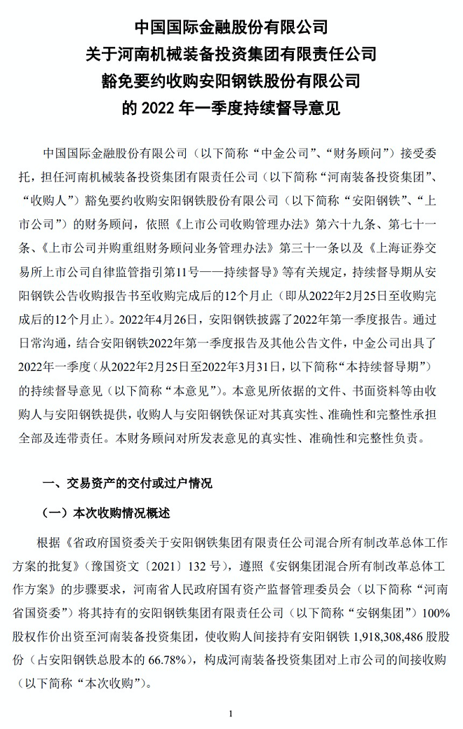 5月10日,安陽(yáng)鋼鐵發(fā)布了《中國(guó)國(guó)際金融股份有限公司關(guān)于河南機(jī)械裝備投資集團(tuán)有限責(zé)任公司豁免要約收購(gòu)安陽(yáng)鋼鐵股份有限公司的2022年一季度持續(xù)督導(dǎo)意見(jiàn)》公告(以下簡(jiǎn)稱(chēng)公告)。