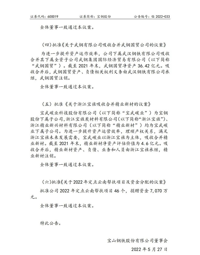 5月27日晚,寶鋼股份發布第八屆董事會第十四次會議決議公告,批準《關于武鋼有限公司吸收合并武鋼國貿公司的議案》《關于浙江寶旌吸收合并精業新材的議案》。