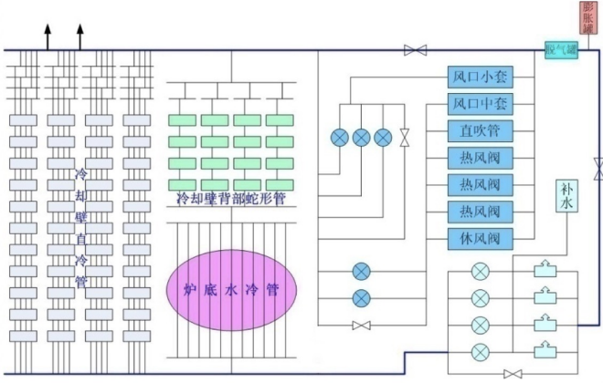 該系統根據高爐內各冷卻設施熱負荷特點和阻損匹配原則,將冷卻壁、爐底水冷系統、風口系統、熱風閥系統等,通過并聯與串聯的整合方式巧妙地合并成一個系統。