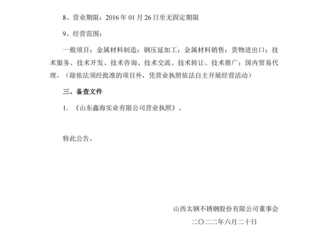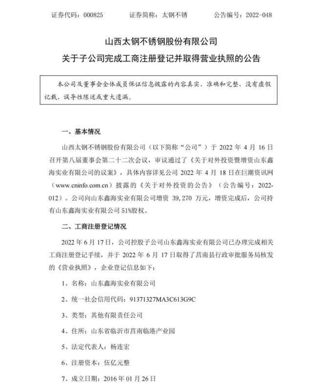 6月21日,山西太鋼不銹鋼股份有限公司發(fā)布公告稱,2022年6月17日,公司控股子公司山東鑫海實業(yè)有限公司已辦理完成相關工商注冊登記手續(xù),并于2022年6月17日取得了莒南縣行政審批服務局核發(fā)的《營業(yè)執(zhí)照》。