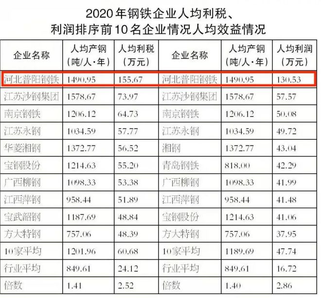 普陽(yáng)鋼鐵在行業(yè)內(nèi)以精益化管理和效益好著稱,根據(jù)鋼協(xié)發(fā)布的數(shù)據(jù),普陽(yáng)鋼鐵是2020年鋼鐵企業(yè)人均利稅、利潤(rùn)排名第一的企業(yè)。即使在2015年的鋼鐵"寒冬“,普陽(yáng)鋼鐵也實(shí)現(xiàn)了盈利,全年實(shí)現(xiàn)銷售收入124億元、利稅19.7億元、利潤(rùn)9億元。