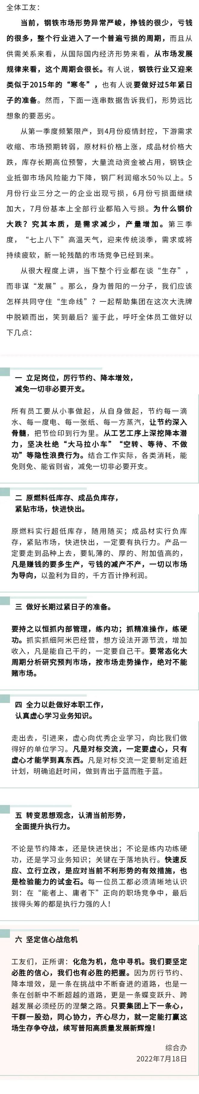 7月18日,普陽(yáng)鋼鐵在公眾號(hào)發(fā)布《告全體員工書》,指出當(dāng)前鋼鐵市場(chǎng)形勢(shì)異常嚴(yán)峻,整個(gè)行業(yè)進(jìn)入了一個(gè)普遍虧損的周期,形勢(shì)遠(yuǎn)比想象的要惡劣。為什么鋼價(jià)大跌?究其本質(zhì),是需求減少,產(chǎn)量增加。第三季度,“七上八下”高溫天氣,迎來(lái)傳統(tǒng)淡季,需求或?qū)⒊掷m(xù)疲軟,新一輪殘酷的市場(chǎng)競(jìng)爭(zhēng)已經(jīng)到來(lái)。從很大程度上講,當(dāng)下整個(gè)行業(yè)都在談“生存”,而非謀“發(fā)展”。為此,普陽(yáng)鋼鐵呼吁全體員工做好長(zhǎng)期過(guò)緊日子的準(zhǔn)備,并強(qiáng)調(diào),產(chǎn)品一定要走到品種上去,要軋薄的、厚的、附加值高的,凡是賺錢的要多生產(chǎn),虧錢的減產(chǎn)不產(chǎn),一切以市場(chǎng)為導(dǎo)向,以盈利為目的,千方百計(jì)掙利潤(rùn)。