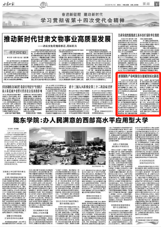 近日,甘肅日報發表文章《酒鋼鋼鐵產業噸鋼綜合能耗創歷史新低》,報道了酒鋼集團宏興股份公司大力開展節能降碳工作,噸鋼綜合能耗創歷史新低,主要工序能耗均完成國家能耗限額標準的情況。(詳情點擊鏈接:https://shuzibao.gansudaily.com.cn/pc/layout/202207/27/node_02.html)