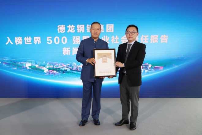 當天,《財富》雜志向德龍鋼鐵集團頒發世界500強證書,丁立國接受證書。