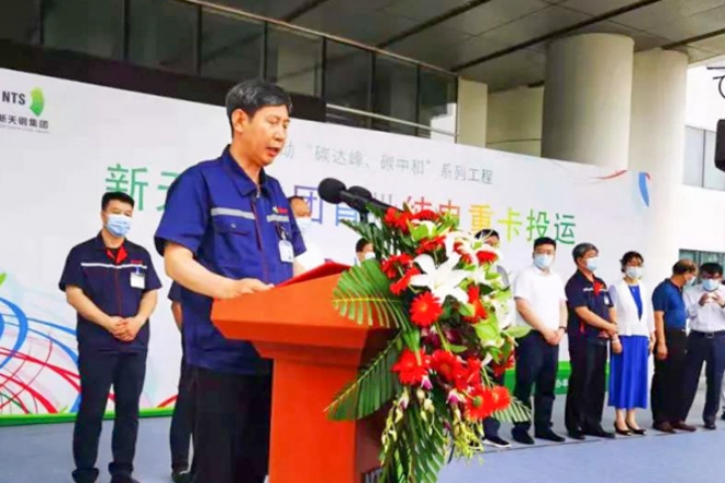 圖為新天鋼綠色低碳運輸重卡投運。
