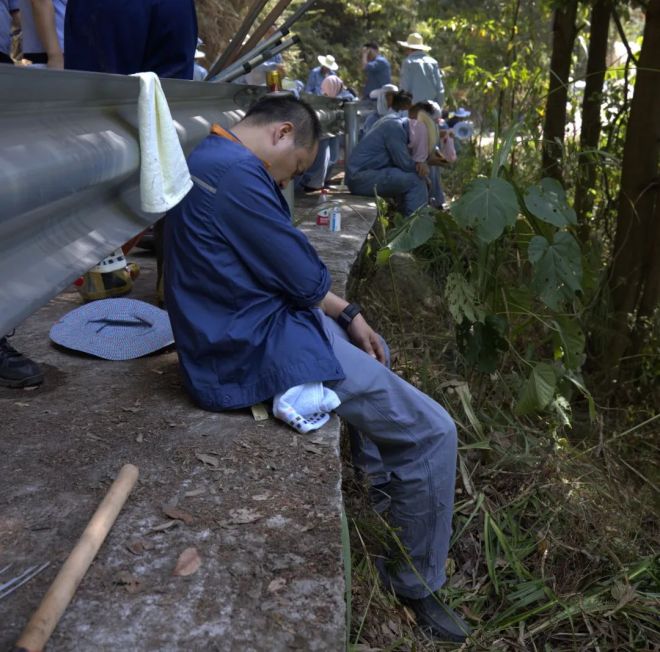 救援人員坐在路旁休息