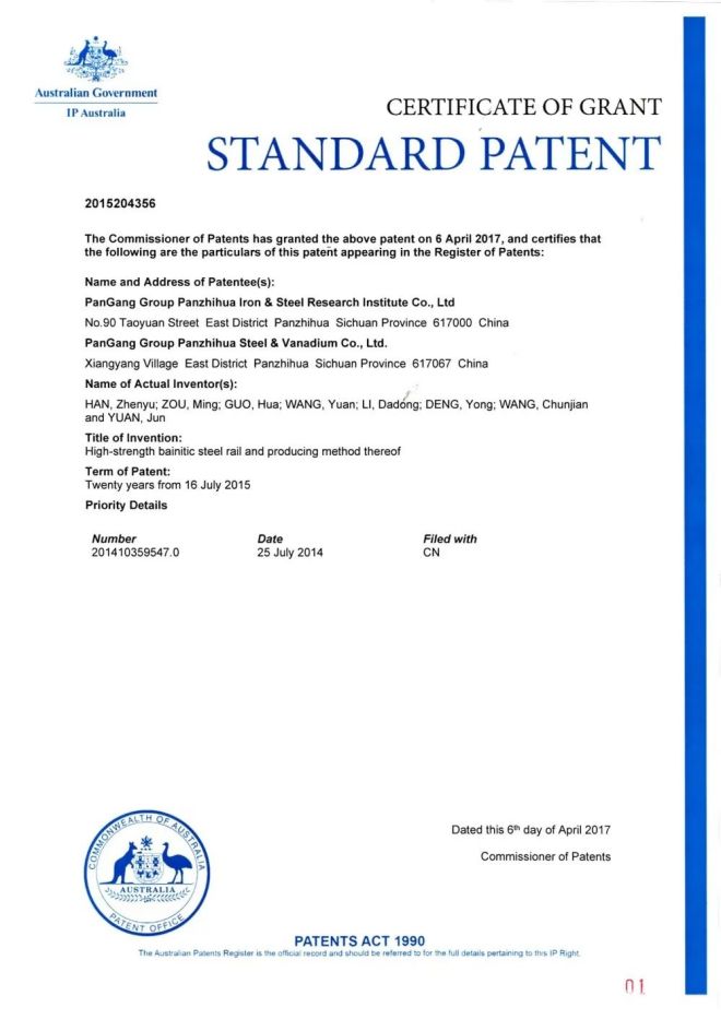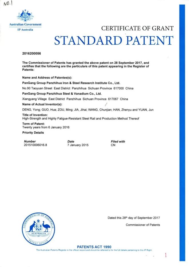 近日,小編得到最新信息:攀鋼收到了澳大利亞專利局發來的《控制中上限Mn含量R350HT鋼軌閃光焊接接頭組織的工藝》專利授權證書。目前,攀鋼在鋼軌領域獲得的授權國際專利已超過40項。