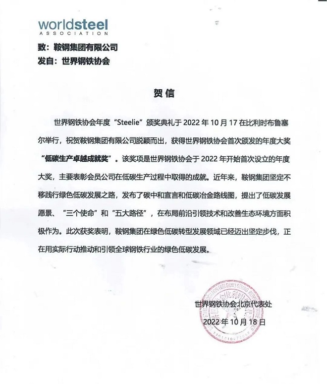 世界鋼鐵協(xié)會在發(fā)給鞍鋼集團(tuán)的賀信中這樣表示,近年來,鞍鋼集團(tuán)堅定不移走綠色低碳發(fā)展之路,發(fā)布了碳中和宣言和低碳冶金路線圖,提出了低碳發(fā)展愿景、“三個使命”和“五大路徑”,在布局前沿引領(lǐng)技術(shù)和改善生態(tài)環(huán)境方面積極作為。此次獲獎表明,鞍鋼集團(tuán)在綠色低碳轉(zhuǎn)型發(fā)展領(lǐng)域已經(jīng)邁出堅定步伐,正在用實際行動推動和引領(lǐng)全球鋼鐵行業(yè)的綠色低碳發(fā)展。