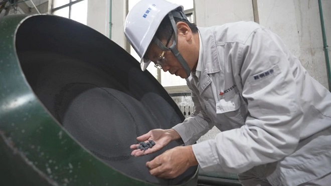 ▲周明順正在檢查球團(tuán)礦質(zhì)量。
