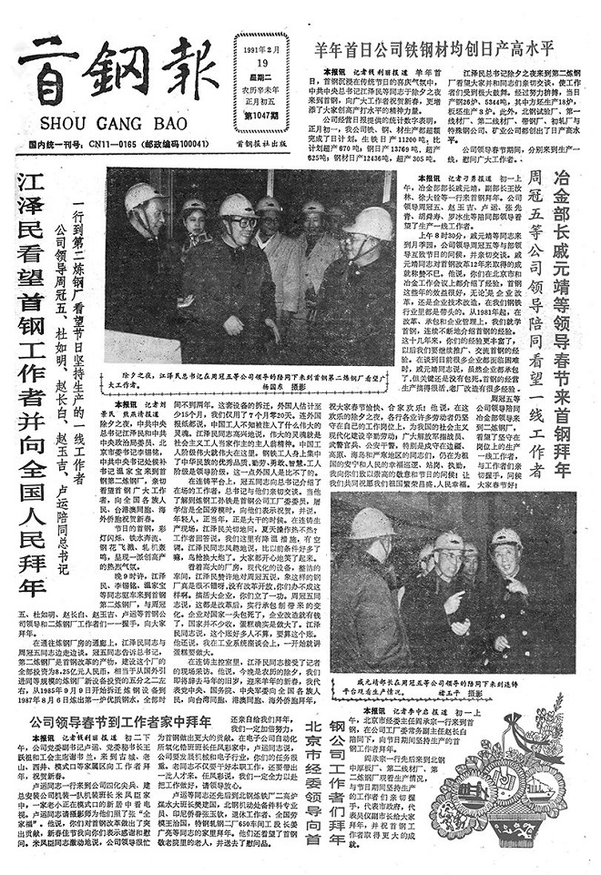 1991年2月14日(除夕)晚9時(shí)許,江澤民同志來(lái)到首鋼第二煉鋼廠,親切看望首鋼廣大職工,并在這里向全國(guó)各族人民、臺(tái)港澳同胞、海外僑胞祝賀新春。