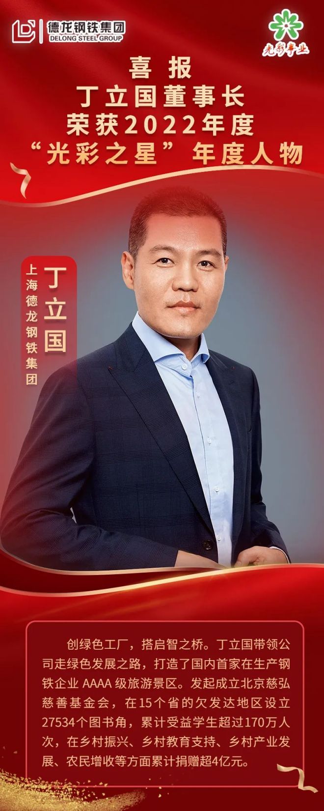 2月21日,中國光彩事業(yè)促進會在北京舉辦了2022年度“光彩之星”集中發(fā)布推介,表彰了一批促進鄉(xiāng)村振興、助力共同富裕的優(yōu)秀民營企業(yè)家,德龍鋼鐵集團董事長丁立國榮獲2022年度“光彩之星”年度人物。