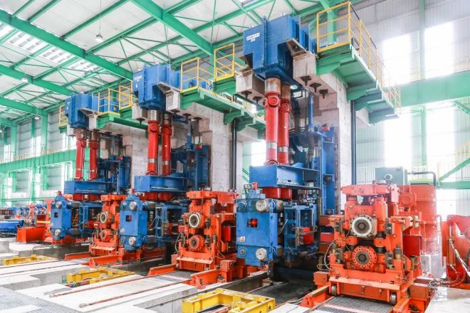 生產線設有燃高爐煤氣步進梁式加熱爐一座,共有58架軋機,分為6架粗軋機組(共用)、10架中軋機組(分A/B線)、4架預精軋機組(分A/B線)、2套精軋機組(分A/B線)。粗、中軋機組及預精軋前2架軋機采用平、立交替布置短應力線軋機。預精軋機組后4架軋機,采用懸臂軋機,均為平、立交替布置,每架軋機均由交流電機單獨傳動。