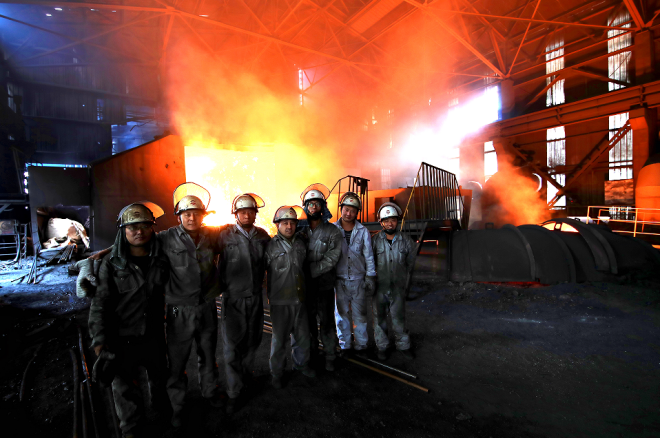 煉鐵廠最后一爐鐵水的當班爐前工在爐臺合影。