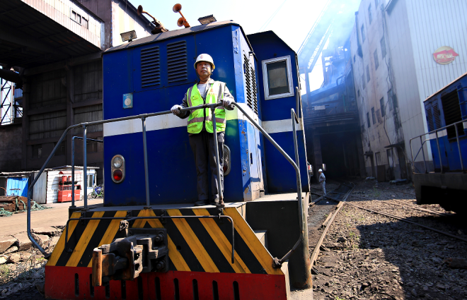 原料部老員工伊寶利在淘汰的運鐵機車上合影留念。