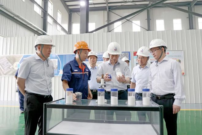 劉安棟一行首先來到中鋼礦院先進粉體材料產業園,實地查看高性能空心玻璃微珠生產線、碳氣凝膠生產線,聽取有關研發生產銷售情況匯報,肯定了產業園建設成效,勉勵繼續穩步發展。在隨后的座談會上,劉安棟聽取了中鋼礦院2023年以來科研生產經營及黨建工作開展情況、下一步工作思路舉措等方面匯報。許傳華對當前工作提出了具體要求。