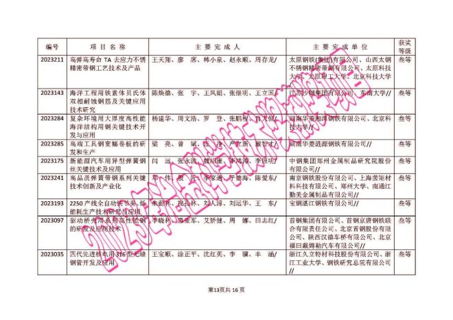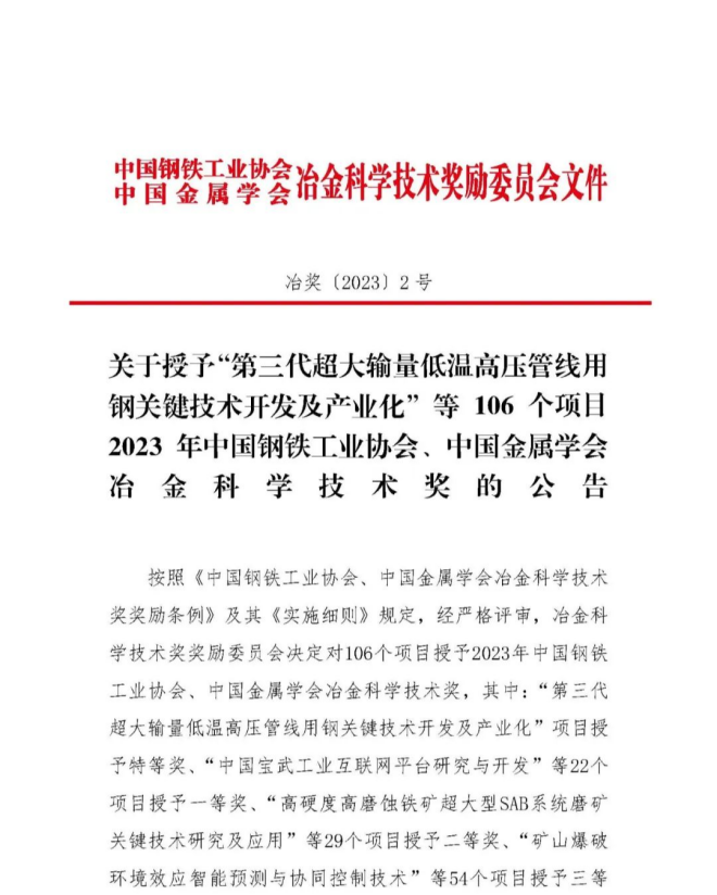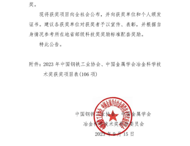 9月18日,中國(guó)鋼鐵工業(yè)協(xié)會(huì)、中國(guó)金屬學(xué)會(huì)冶金科學(xué)技術(shù)獎(jiǎng)勵(lì)委員會(huì)正式公告了2023年冶金科學(xué)技術(shù)獎(jiǎng)獲獎(jiǎng)名單。建龍集團(tuán)共斬獲5個(gè)獎(jiǎng)項(xiàng)——一等獎(jiǎng)、二等獎(jiǎng)各1項(xiàng),三等獎(jiǎng)3項(xiàng),牽頭項(xiàng)目獲獎(jiǎng)數(shù)量位列行業(yè)第四,在民營(yíng)鋼鐵企業(yè)中位居第一,獲獎(jiǎng)數(shù)量和等級(jí)實(shí)現(xiàn)了歷史雙突破!