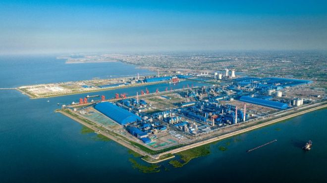 該項目于2020年8月28日開工建設,伴隨著抗擊新冠疫情、抵御臺風、寒冬酷暑等給工程建設帶來的巨大挑戰,實現了沿海灘涂變身鋼鐵新城,為鋼鐵工業助力中國式現代化發展提供了范本。