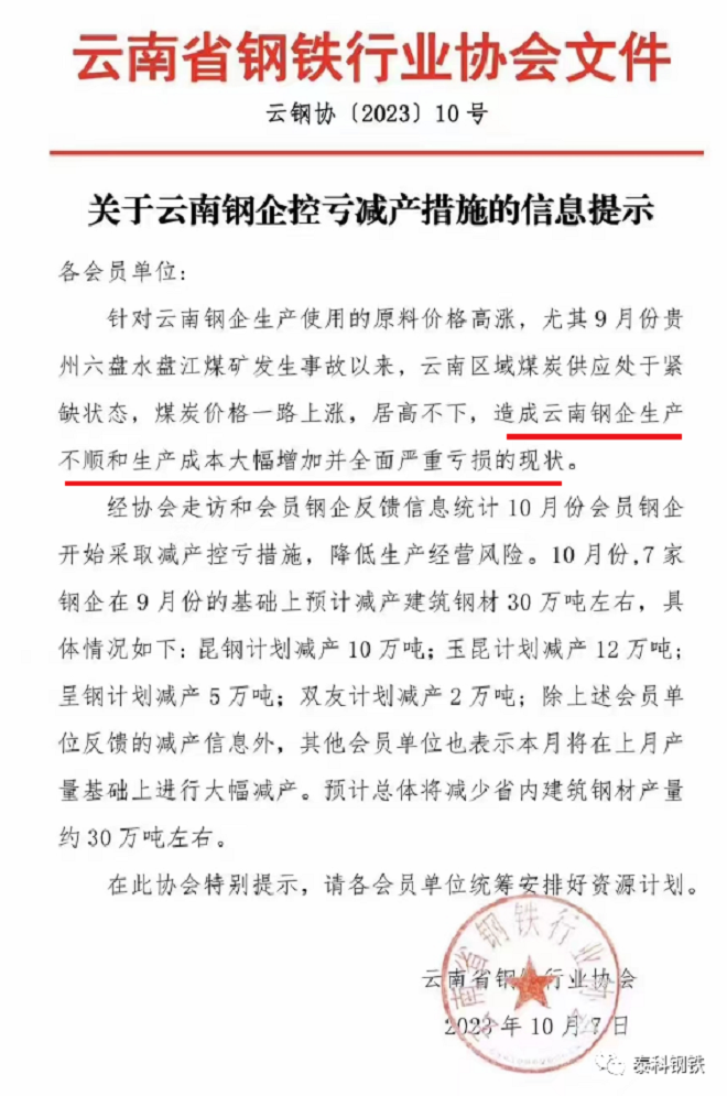 云南省鋼鐵工業協會于10月7日發布《關于云南鋼企控虧減產措施的信息提示》:針對云南鋼企生產使用的原料價格高漲,尤其9月份貴州六盤水盤江煤礦發生事故以來,云南區域煤炭供應處于緊缺狀態,煤炭價格一路上漲,居高不下,造成云南鋼企生產不順和生產成本大幅增加并全面嚴重虧損的現狀。10月份,7家鋼企在9月份的基礎上預計減產建筑鋼材30萬噸左右,具體情況如下:昆鋼計劃減產10萬噸;玉昆計劃減產12萬噸;呈鋼計劃減產5萬噸;雙友計劃減產2萬噸;除上述會員單位反饋的減產信息外,其他會員單位也表示本月將在上月產量基礎上進行大幅減產。預計總體將減少省內建筑鋼材產量約30萬噸左右。