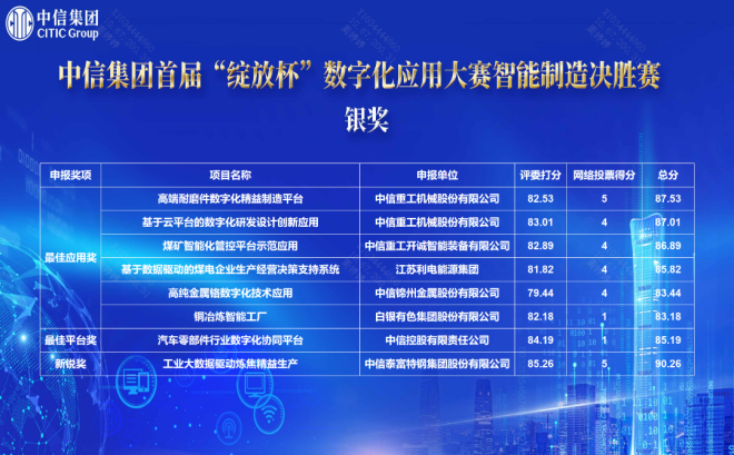 來(lái)自中信重工、中信戴卡、中信控股、中信泰富特鋼、中信錦州金屬、利電能源、白銀有色的16個(gè)參賽項(xiàng)目經(jīng)過(guò)專家書面評(píng)審,殺進(jìn)決勝賽,角逐“最佳應(yīng)用獎(jiǎng)”“最佳平臺(tái)獎(jiǎng)”“新銳獎(jiǎng)”三大獎(jiǎng)項(xiàng)。中信泰富特鋼共有6個(gè)項(xiàng)目入圍決勝賽。