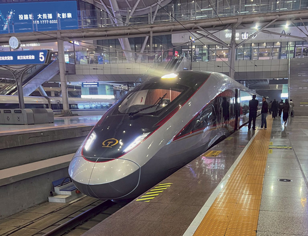 圖為整列裝用國產(chǎn)高速車輪的G364次復(fù)興號長編組動車組從武漢站駛出,駛向天津。(陳靈通/攝)
