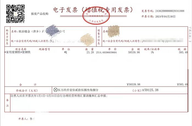 4月29日《公告》正式實(shí)施后,歐冶鏈金認(rèn)真落實(shí)國(guó)家推動(dòng)大規(guī)模設(shè)備更新和消費(fèi)品以舊換新戰(zhàn)略和國(guó)稅總局的具體要求,號(hào)召各子公司積極申報(bào)開(kāi)具“反向開(kāi)票”,打通開(kāi)票流程。4月30日上午,歐冶鏈金萍鄉(xiāng)公司在萍鄉(xiāng)市經(jīng)開(kāi)區(qū)稅務(wù)局的支持和指導(dǎo)下,成功向自然人報(bào)廢產(chǎn)品出售者開(kāi)出了歐冶鏈金首張“反向發(fā)票”。隨后,當(dāng)天下午,鏈金物寶也開(kāi)出了本單位首張“反向發(fā)票”。