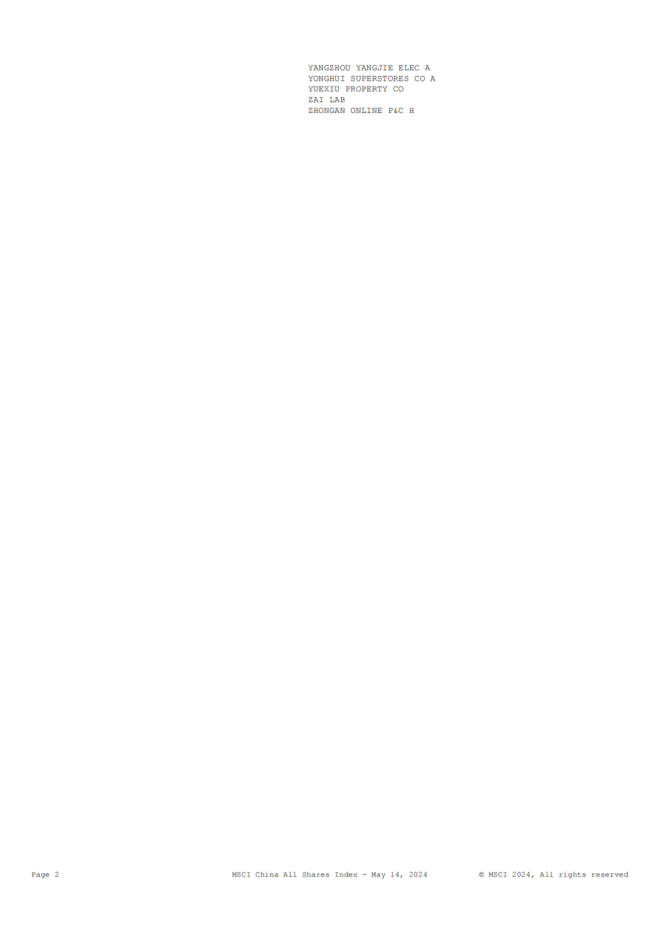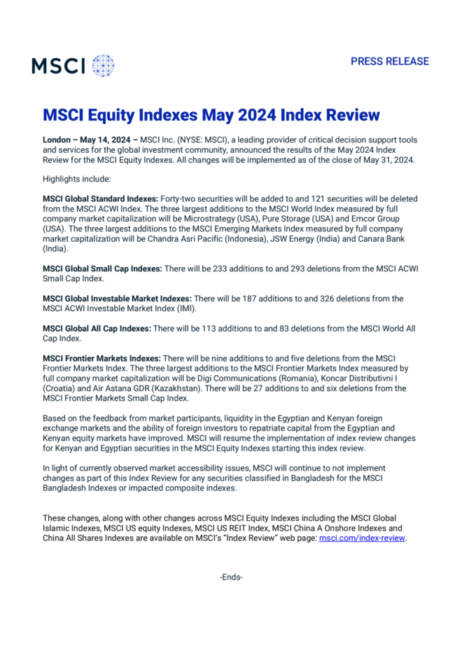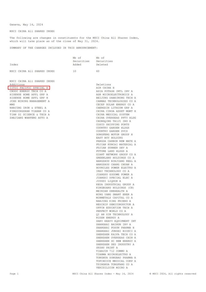 5月15日凌晨,國(guó)際指數(shù)編制公司MSCI公布了其2024年5月的指數(shù)調(diào)整結(jié)果。本次調(diào)整中,MSCI全球標(biāo)準(zhǔn)指數(shù)新增42只個(gè)股,其中,中信特鋼(000708.SZ)等8只A股標(biāo)的新增納入MSCI中國(guó)A股指數(shù)。MSCI公告顯示,本次調(diào)整結(jié)果將于2024年5月31日收盤后生效。