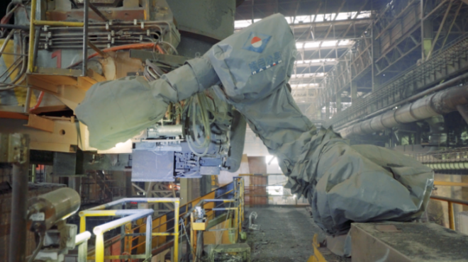 記者來到澆鋼平臺,發現在往日那種爐火照天地,鋼花四濺、噪聲刺耳的澆鋼平臺現場,工人揮汗如雨,手持各種工具熱火朝天干活的場面遁形了!現場取而代之的是行云流水、一氣呵成的澆鋼過程:從鋼包放入回轉臺起,視覺+激光傳感器將自動識別行車車鉤狀態,之后,機器人自動安裝油缸、回轉臺自動旋轉、烘烤器自動抬升、中包車自動行走、對中,與此同時、分揀機器人有條不紊的執行覆蓋劑分揀工作、澆鋼機器人帶著掃描槍進行位置掃描準備、智能操作臂帶著長水口蓄勢待發進行長水口套接,智能操作臂和澆鋼機器人協同完成下水口掃描和長水口套接作業、自動開澆系統控制鑄機自動開澆,再加上機器人自動測溫取樣、自動下渣檢測、在線電動調寬……各項智能裝備代替人工開展生產操作,有序完成了全流程自動澆鋼。