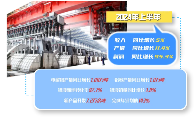 上半年,東興鋁業(yè)公司電解鋁、鋁卷產(chǎn)量分別同比增長(zhǎng)1.08萬(wàn)噸、1.8萬(wàn)噸,收入同比增長(zhǎng)5%,工業(yè)總產(chǎn)值同比增長(zhǎng)11.4%,利潤(rùn)同比增長(zhǎng)95.3%。