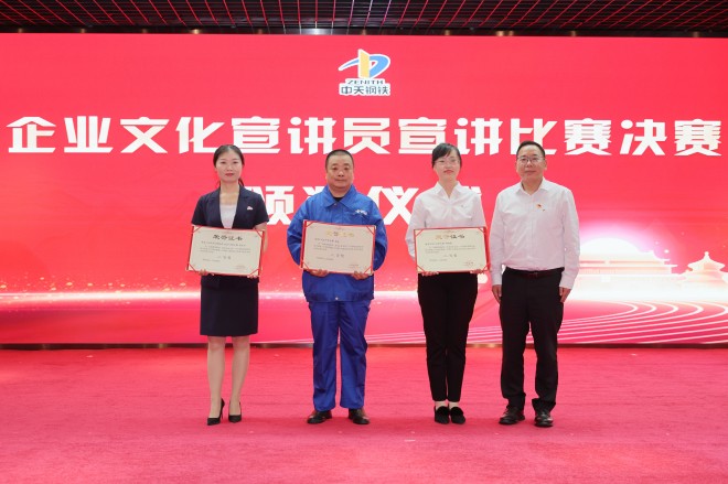 本次活動公布了企業(yè)文化宣講系列活動獲獎名單,中天南通數(shù)控中心設備口黨支部、二軋廠黨支部獲得企業(yè)文化知識競賽一等獎,中天特鋼燒結(jié)廠成逸卿、中天淮安黨群工作處王雨獲得宣講員比賽一等獎。活動還表彰了10個企業(yè)文化優(yōu)秀小故事(案例)和6個企業(yè)文化宣貫活動優(yōu)秀組織獎。