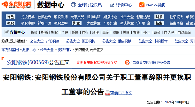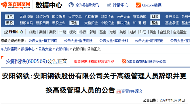 10月1日,安陽鋼鐵(600569)發布了《安陽鋼鐵股份有限公司關于高級管理人員辭職并更換高級管理人員的公告》與《安陽鋼鐵股份有限公司關于職工董事辭職并更換職工董事的公告》。