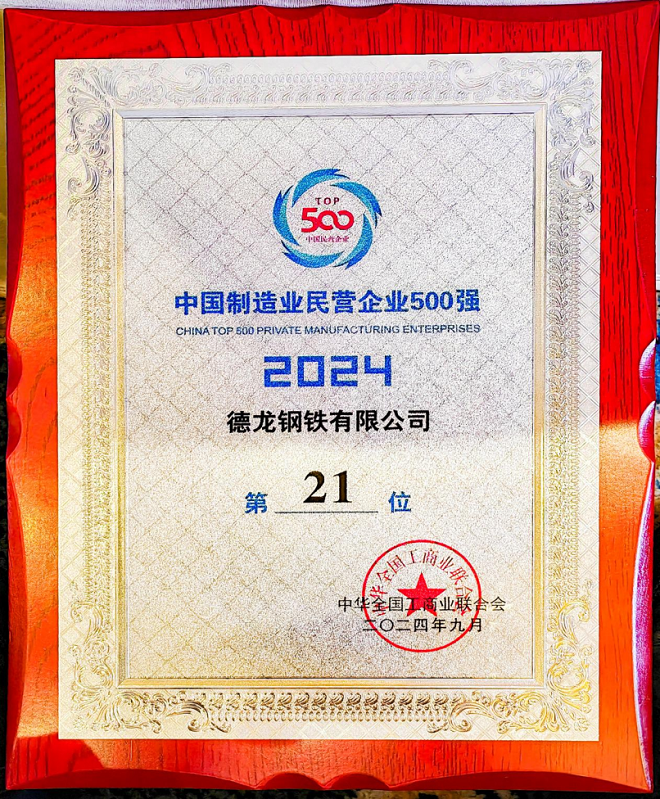 多年來(lái),德龍鋼鐵集團(tuán)在丁立國(guó)董事長(zhǎng)的帶領(lǐng)下,始終秉持著理想不改、創(chuàng)新不止、事業(yè)向善、惟有奮斗的企業(yè)精神,已經(jīng)發(fā)展成為一家跨區(qū)域、跨國(guó)界的大型綜合鋼鐵集團(tuán),如今,德龍鋼鐵已連續(xù)三年入榜世界企業(yè) 500 強(qiáng),位列榜單第 452 位,充分展現(xiàn)了其在國(guó)際市場(chǎng)的強(qiáng)大影響力。同時(shí),德龍鋼鐵榮登 2024 年中國(guó)企業(yè) 500 強(qiáng)第 118 位,更是行業(yè)內(nèi)標(biāo)桿企業(yè)地位的有力彰顯。而此次,德龍鋼鐵再傳捷報(bào),榮登 2024 中國(guó)制造業(yè)民營(yíng)企業(yè) 500 強(qiáng)第 21 位、中國(guó)民營(yíng)企業(yè) 500 強(qiáng)第 30 位!