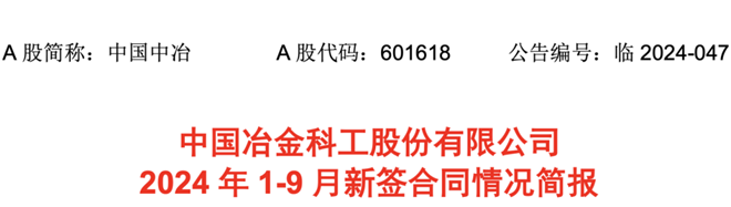 10月15日,中國冶金科工股份有限公司(以下簡稱“中國中冶”)發布了《中國冶金科工股份有限公司2024年1-9月新簽合同情況簡報》(以下簡稱《簡報》)。