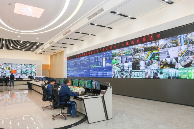 在永卓控股旗下永鋼集團水處理車間集控中心,墻上大屏實時更新著污水處理進度、設備運行數據及現場作業監控。