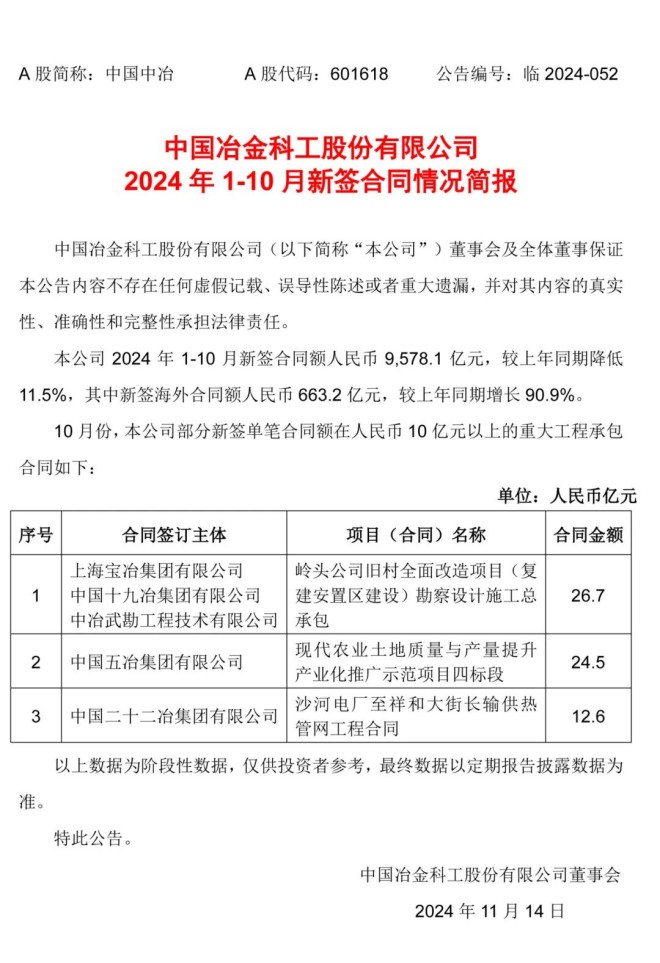 中國中冶11月14日晚間公告,1-10月,公司新簽合同額9578.1億元,其中新簽海外合同額663.2億元,較上年同期增長90.9%。