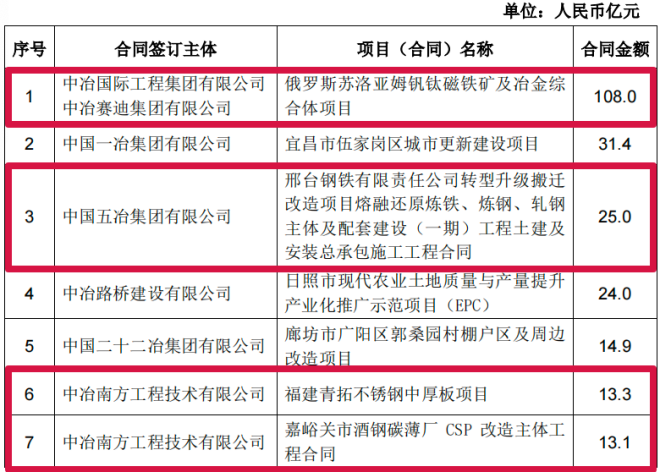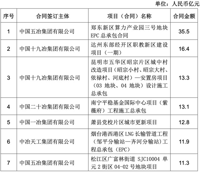 7月部分新簽單筆合同額在人民幣10億元以上的重大工程承包合同