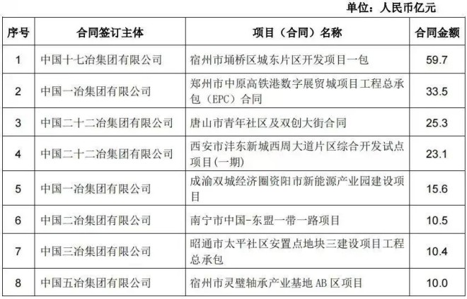 8月部分新簽單筆合同額在人民幣10億元以上的重大工程承包合同