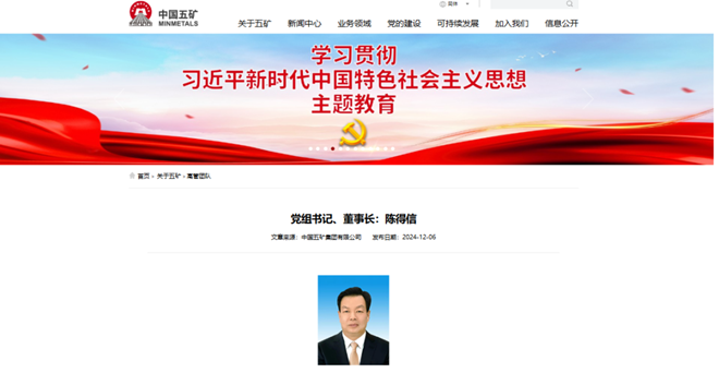 2024年12月6日上午,中國五礦集團(tuán)有限公司召開中層以上管理人員大會(huì)。中央組織部有關(guān)負(fù)責(zé)同志宣布了黨中央關(guān)于中國五礦集團(tuán)有限公司主要負(fù)責(zé)同志調(diào)整的決定:陳得信同志任中國五礦集團(tuán)有限公司董事長、黨組書記,免去其中國五礦集團(tuán)有限公司總經(jīng)理職務(wù)。相關(guān)職務(wù)任免,按有關(guān)法律和章程的規(guī)定辦理。
