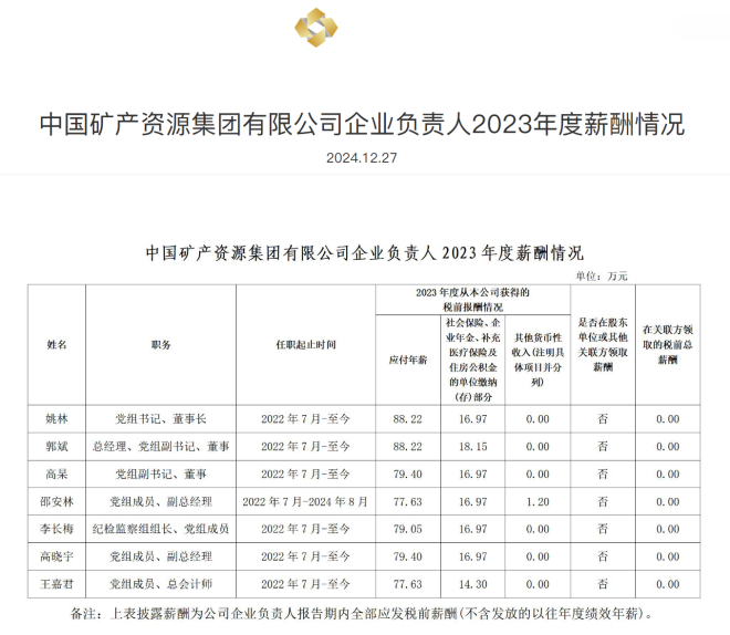 2024年12月27日,中國(guó)礦產(chǎn)資源集團(tuán)有限公司公布企業(yè)負(fù)責(zé)人2023年度薪酬情況。具體情況如下表: