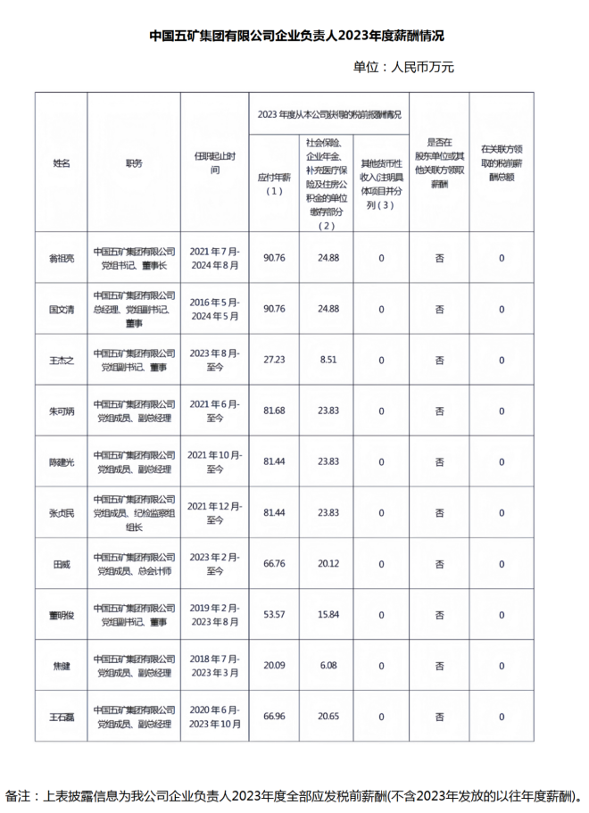 2024年12月27日,中國(guó)五礦集團(tuán)公布企業(yè)負(fù)責(zé)人2023年度薪酬情況。具體情況如下: