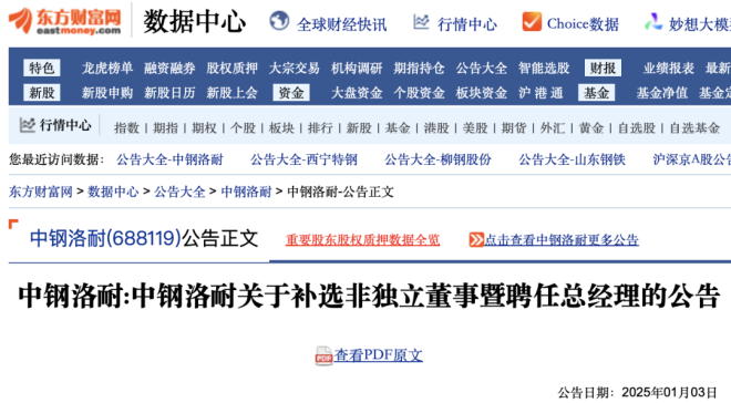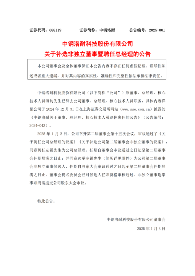 1月3日,中鋼洛耐發(fā)布《關(guān)于補選非獨立董事暨聘任總經(jīng)理的公告》(以下簡稱《公告一》。