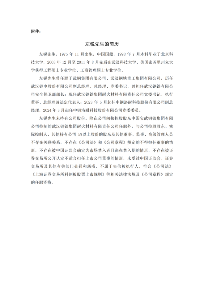 左銳先生曾任職于武鋼集團有限公司、武漢鋼鐵重工集團有限公司,歷任武漢鋼電股份有限公司副總經(jīng)理、總經(jīng)理、黨委書記,曾擔(dān)任武漢鋼鐵有限公司安全保衛(wèi)部部長;現(xiàn)任武漢鋼鐵集團耐火材料有限責(zé)任公司黨委書記、執(zhí)行董事、總經(jīng)理兼法定代表人;2023年5月起任中鋼洛耐科技股份有限公司副總經(jīng)理,2024年3月起任中鋼洛耐科技股份有限公司黨委委員。