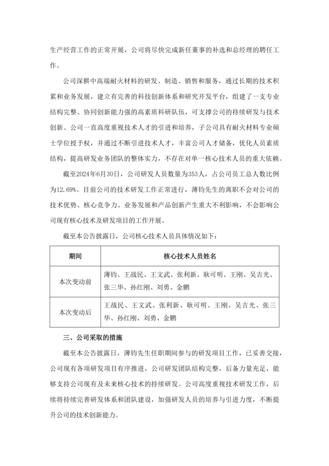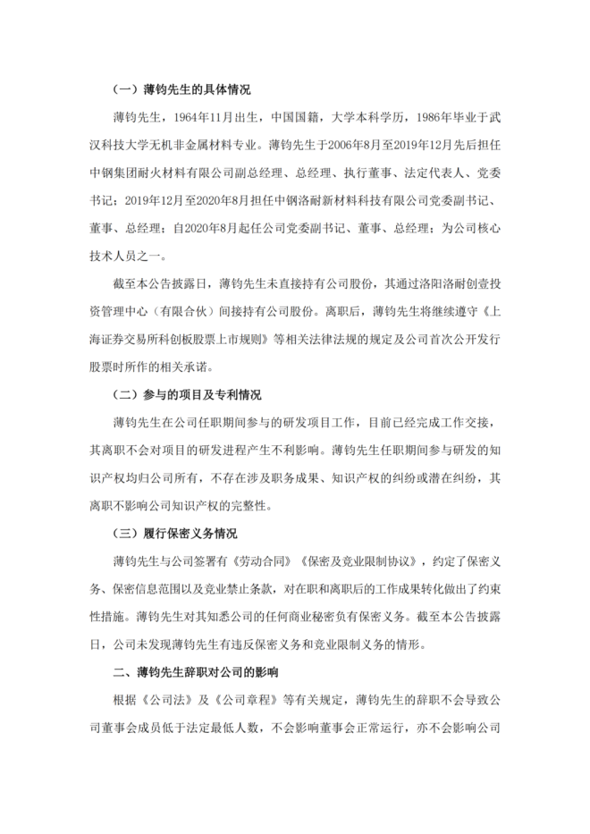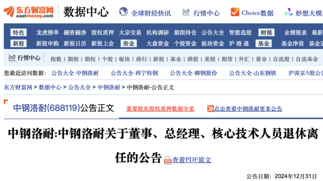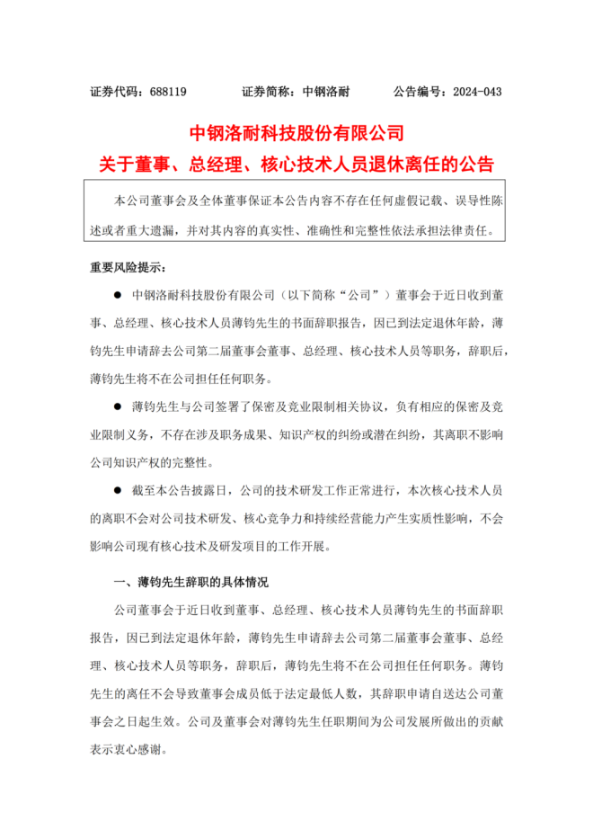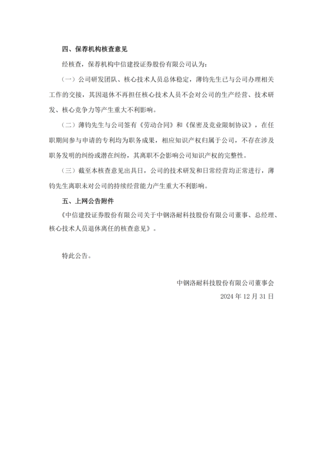 2024年12月31日,中鋼洛耐發(fā)布《關(guān)于董事、總經(jīng)理、核心技術(shù)人員退休離任的公告》(以下簡稱《公告二》。